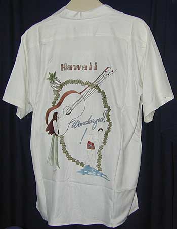 Recently Reduced Price! An incredible Retro Hawaiian Shirt Design by Avanti, featuring Intricate Vintage Style Embroidery of a Hula Girl, Ukelele, and a Surfer.....